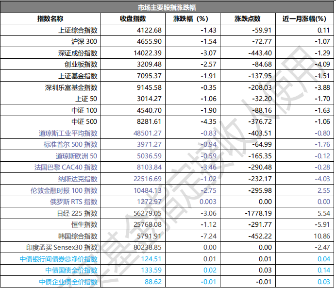 大盤股強(qiáng)于小盤股。中證 100 下跌 1.90%,中證 500 下跌 4.35%。31 個(gè)申萬一級行業(yè)中有 5 個(gè)行業(yè)上漲。其中,石油石化、煤炭、交通運(yùn)輸表現(xiàn)居前,漲跌幅分別為 6.75%、1.76%、1.14%,電子、有色金屬、國防軍工表現(xiàn)居后,漲跌幅分別為-5.30%、-5.61%、-6.74%。滬市有 290 只個(gè)數(shù)上漲,占比 12.59%,深市有 259只個(gè)數(shù)上漲,占比 8.98%。非 ST 個(gè)股中,80 只個(gè)股漲停,59 只個(gè)股跌停。股指期貨主力合約 3 個(gè)合約均下跌,其中,3 只期指好于現(xiàn)貨指數(shù)。